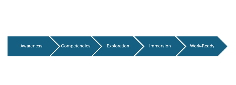 A central goal of the ecosystem is to help students progress through a development pathway that gradually moves from broad awareness to meaningful career readiness.