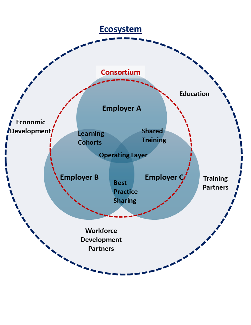 A consortium is a collaborative structure in which multiple organizations work together to pursue shared goals that would be more difficult or costly to achieve independently. In this case, participating employers collaborate to strengthen operational excellence, support workforce development alignment, and build a more capable regional talent system.