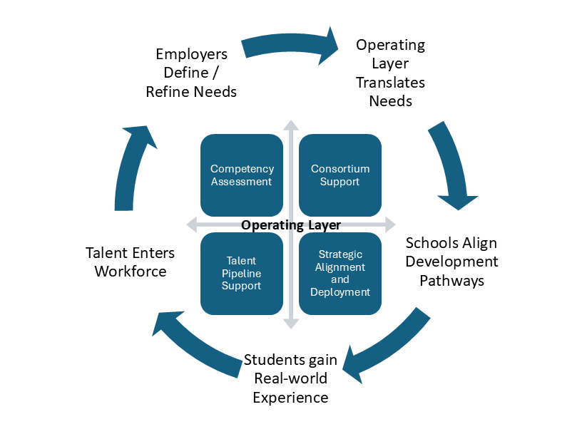 In effect, the operating layer turns what would normally be a fragmented set of efforts into a coordinated system that continuously aligns employer capability, student development, and regional workforce priorities.